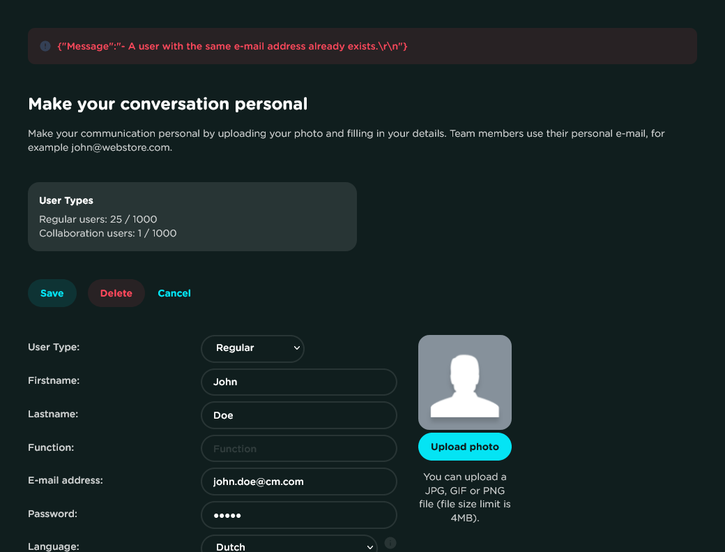 {"Message":"- A user with the same e-mail address already exists.\r\n"}