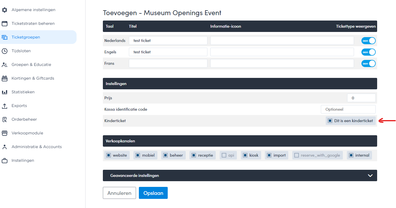 Zodra je binnen ticketgroepen zit & binnen een ticket groep op een bestaand ticket klikt of een nieuw ticket aanmaakt krijg je onderstaand scherm te zien. Je hebt de mogelijkheid om een ticket aan te merken als "dit is een kinderticket". Hiermee kun je het ticket aanmerken als een kinderticket zodat je hier een regel aan kan hangen.