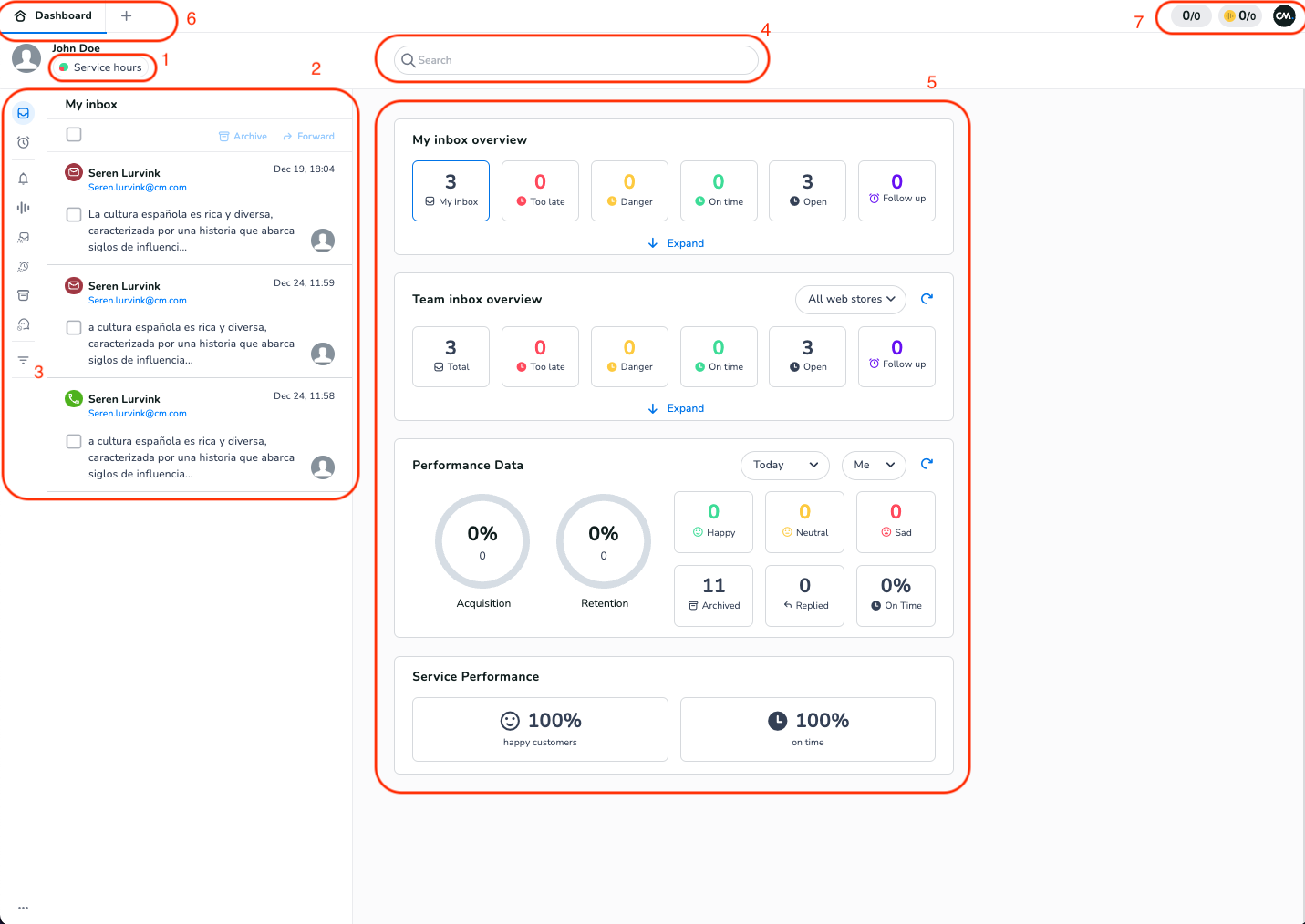 The dashboard is comprised of various elements that let's you effectively handle customer inquiries with your team and across teams.