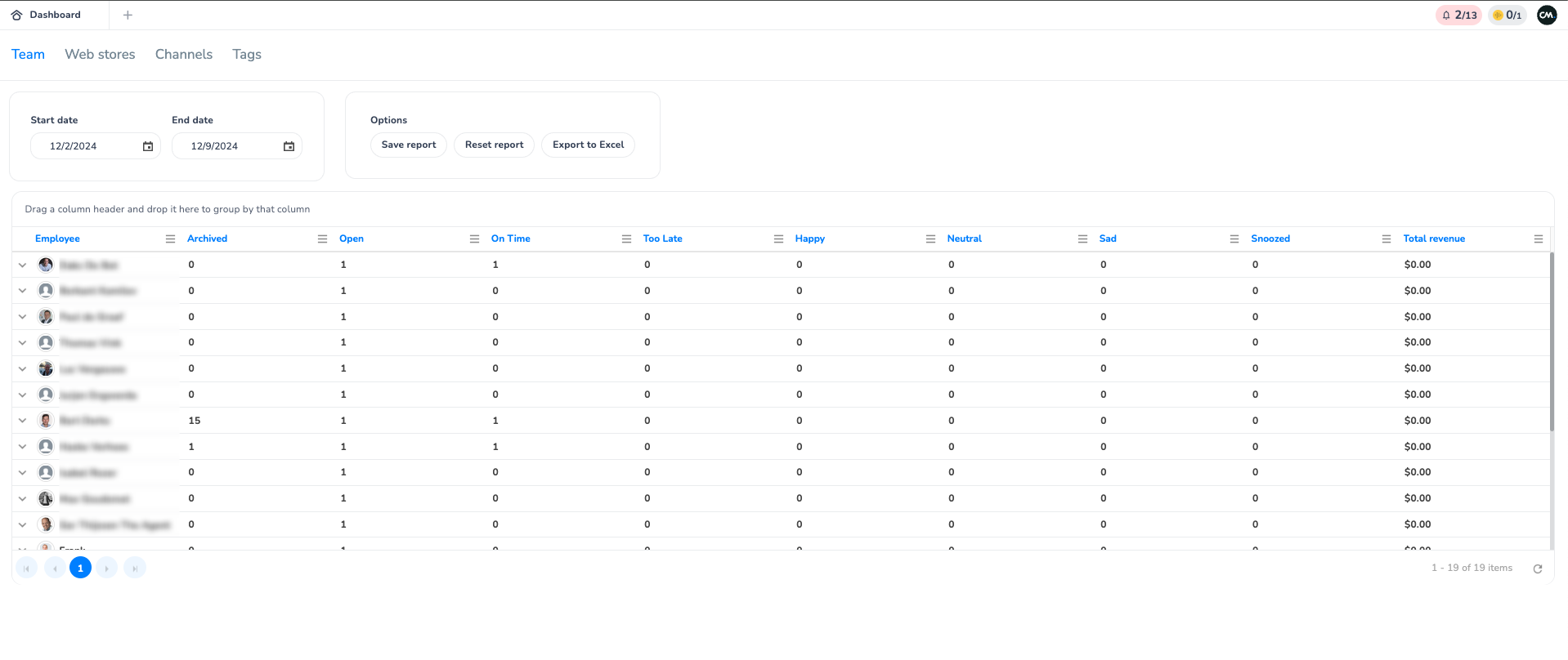 Within the teams section of the reporting, you can find all conversations and characteristics of conversations allocated to specific agents within the team. On the overview, you can find how many conversations and agent is owner of, how many of what the statusses there are, what SLA and rating scores as well as allocated revenue they accumulate to.