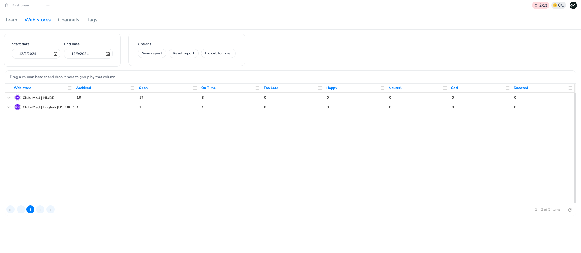 Within the web store section of the reporting, you can find all conversations and characteristics of conversations allocated to a specific web store. On the overview, you can find how many conversations are allocated to what web store, what the status (Open, archived or snoozed), SLA (on time) and rating scores are of those converations.