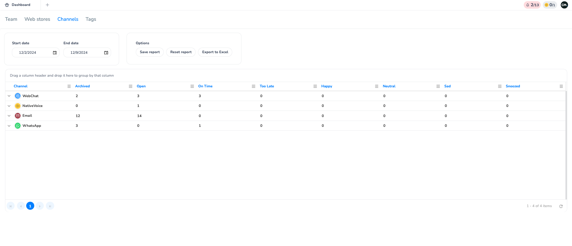 Within the channels section of the reporting, you can find all conversations and characteristics of conversations performed within a specific channel are. On the overview page, you can find how many conversations are performed per channel, what the status (Open, archived or snoozed), SLA (on time) and rating scores are.