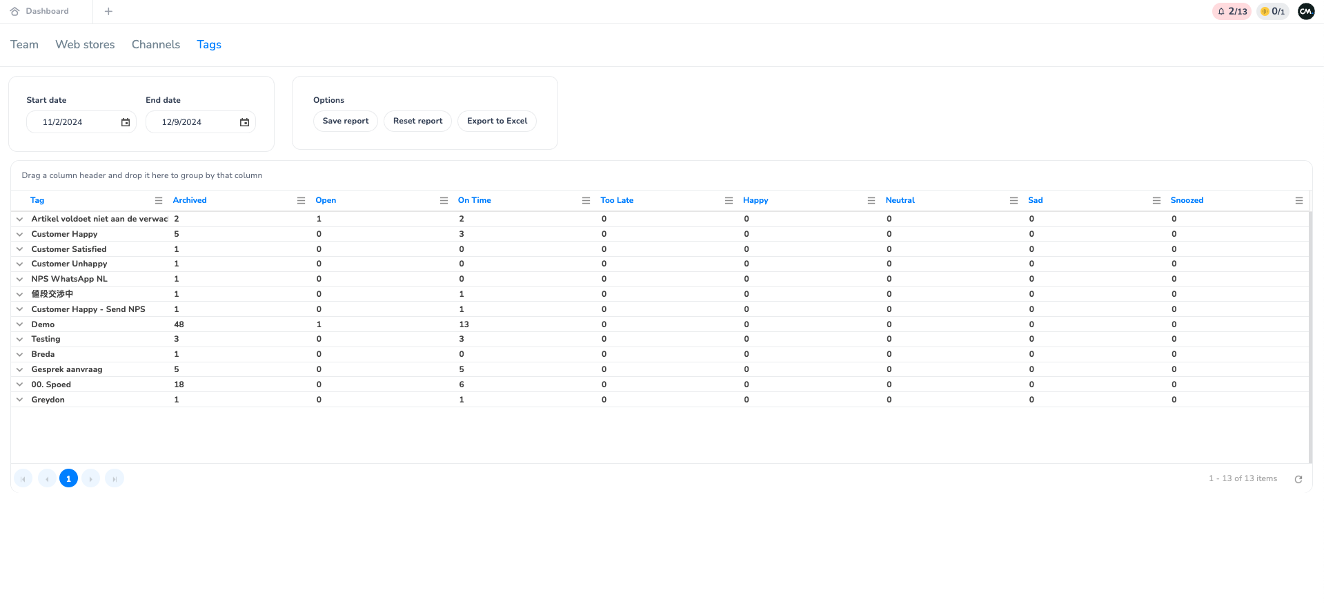 Within the tags section of the reporting, you can find all conversations and characteristics of conversations that where allocated a specific tag. On the overview, you can find how many conversations where allocated to a specific tag, what the status (Open, archived or snoozed), SLA (on time) and rating scores are of these conversations are.