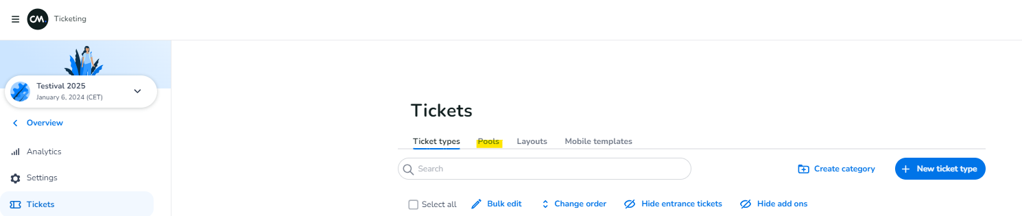 When you create a new ''ticket pool'' you can select the ticket types that you want to link to your newly created poule.