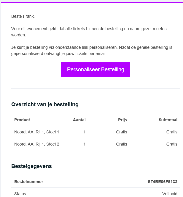 Once the order is completed, the main booker receives an email confirmation with a link to the personalization page.