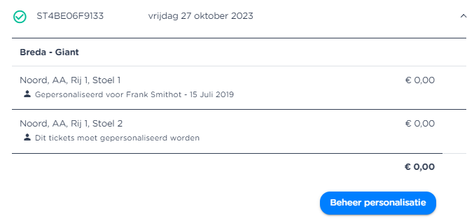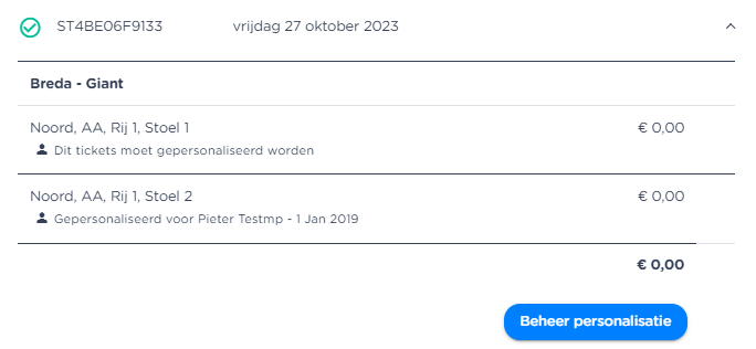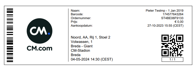 The name of the personalized person will also appear on the ticket. In this example, the name is 'Pieter Testmp - 1 Jan 2019', do not confuse it with a name with a date.