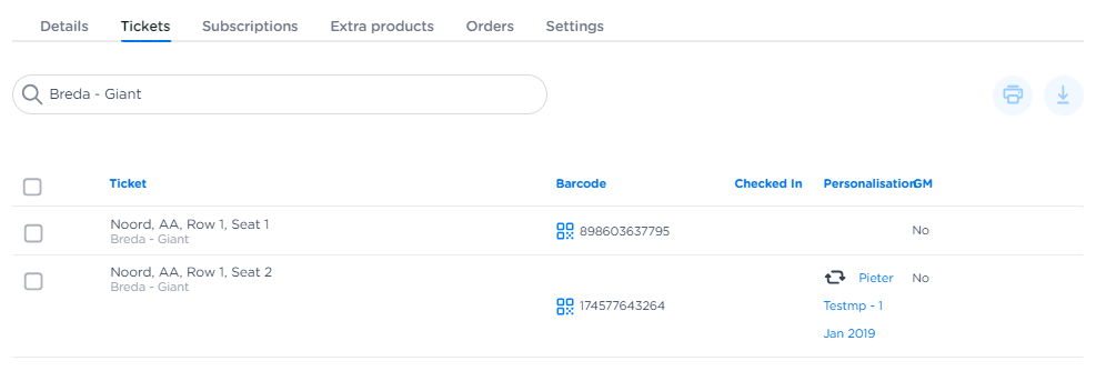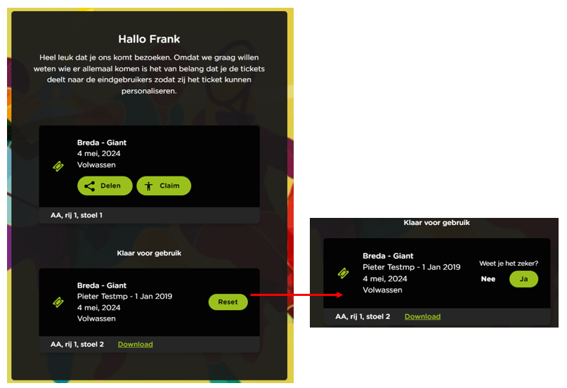 As the main booker, you can always download the ticket, after personalization, for each individual. You can also withdraw a ticket by resetting it. When you click on reset, you will first see an additional warning. After the reset, the barcode remains unchanged.