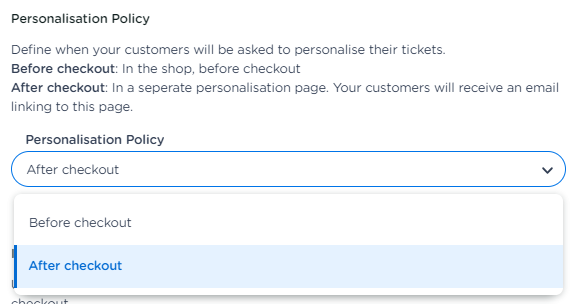 Here, you indicate whether someone can download their order after successful completion, either through the success page or in MyAccount. If it is not activated, it is only possible to download the ticket from the email confirmation. If the personalization policy (point 3) is set to after check out, you do not need to activate this setting. Otherwise, the ticket can be downloaded before personalization takes place. However, you can address this by modifying the URL of the success page in the backend. This way, the ticket cannot be downloaded directly, not even through MyAccount, as it will also indicate that the ticket needs to be downloaded first.