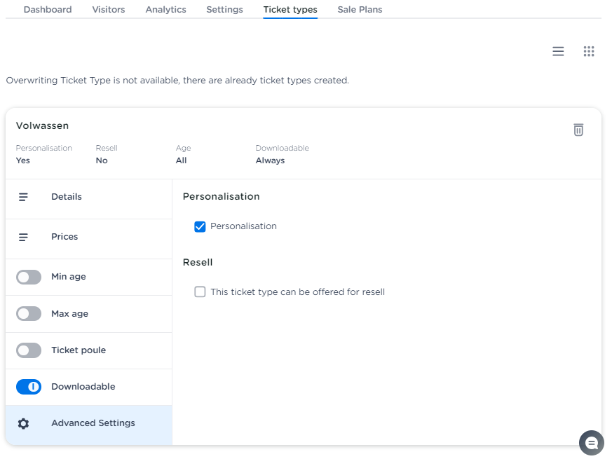 At the ticket type level, you need to set whether personalization is applicable or not. Open the ticket type and click on Advanced Settings in the menu. Please note that when activating personalization, it applies to both tickets booked from the backend Seated and from the online shop.