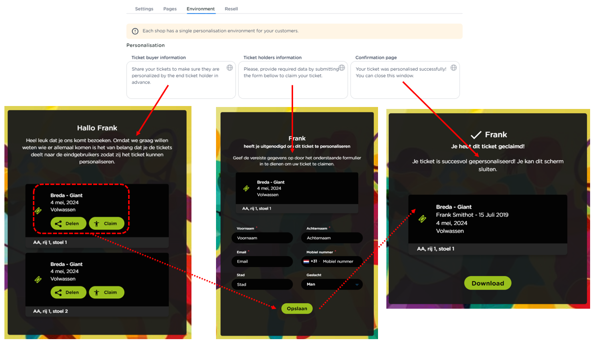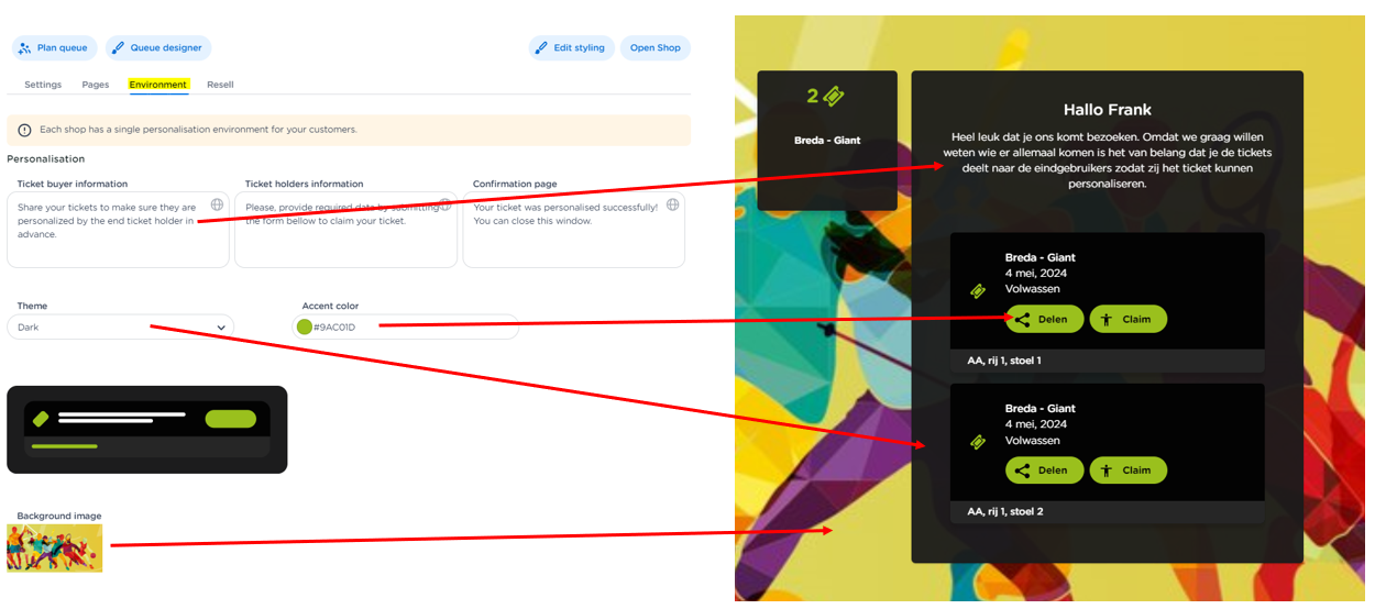 For personalization of tickets (via email), you will be redirected to a personalization page. You can style this page in the shop within the Environment tab.