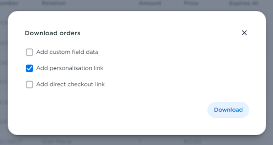 Finally, you can also export all links from the order overview by checking the 'Add personalization link' box in the intermediate step towards the export.