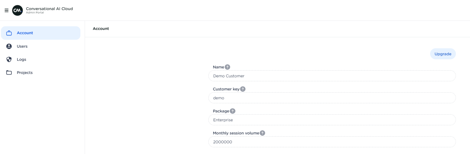 From the account menu of the Admin Portal, you can view your package type, session volume and upgrade your package.