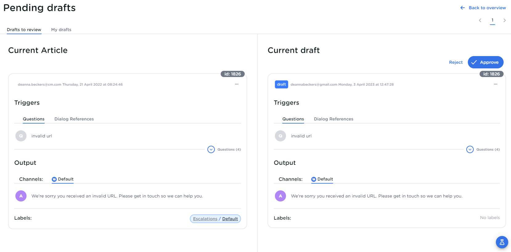 When a content editor makes changes to an article, their content changes will enter its workflow and need to be approved by another team member. The article will only be updated with the latest changes from the draft after it has been reviewed and approved by another team member. This provides customers with a level of reassurance when working with the system.